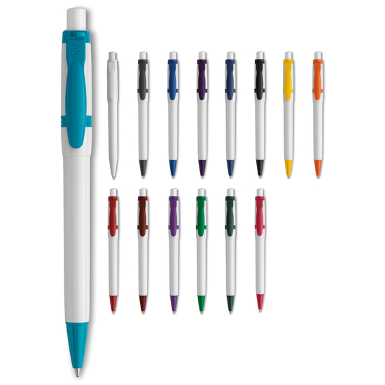 Der Hardcolour Kugelschreiber Olly mit weißem Schaft und farbigem Clip. Ausgestattet mit einer blau schreibenden Jumbo-Mine. Der Druckkugelschreiber besteht aus ABS und wird in Europa hergestellt. Ab einer Abnahmemenge von 5.000 Stück sind eigene Farbkombinationen möglich.