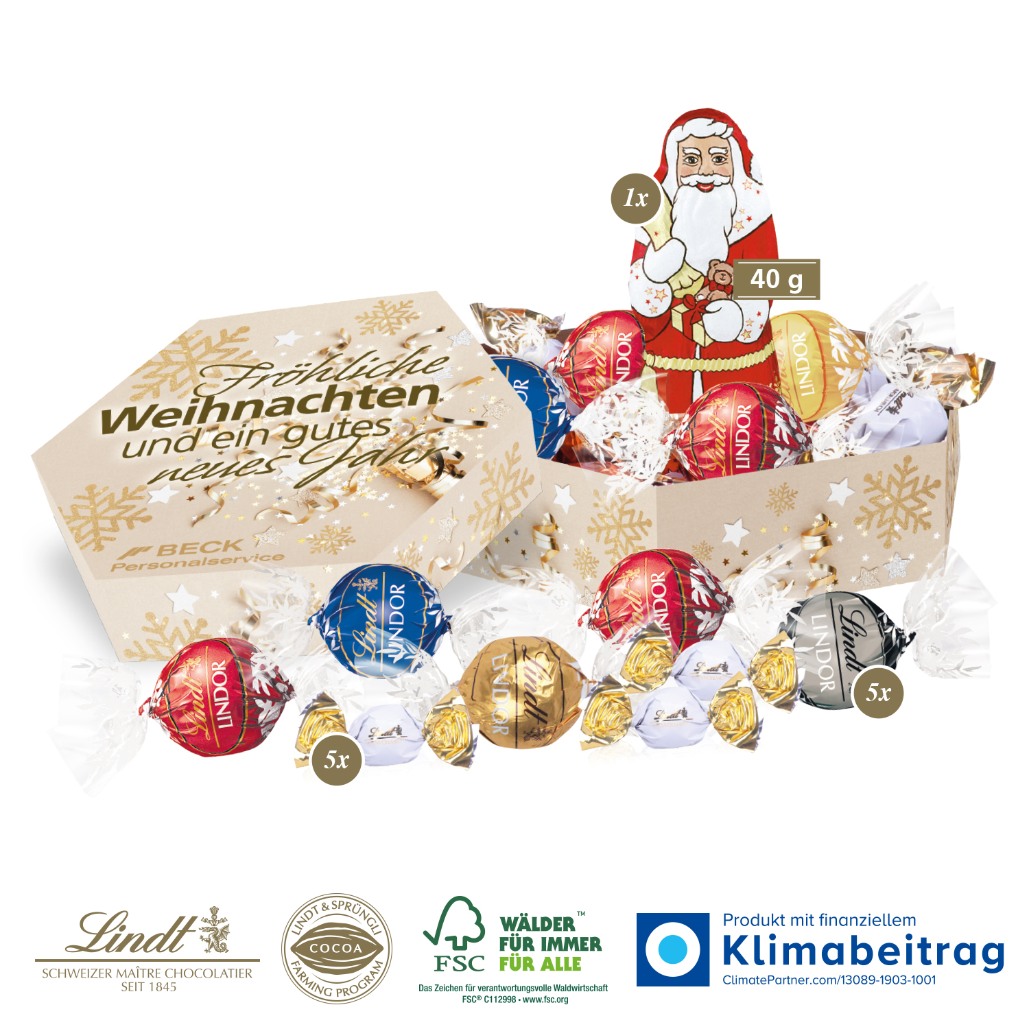 Ein Highlight unter den Business-Präsenten! Die Präsentbox mit exklusiver Lindt Schokolade ist ein wahres Highlight unter den Präsenten. Rundum individuell bedruckbar, sorgt dieses Präsent für einen Aha-Effekt und zeigt echte Wertschätzung. Produktdetails: Exklusive Markenschokolade, verpackt in einer individuellen Werbekartonage. Gleich mitbestellen: Einzelversandkarton für den Postversand: 0,75 Euro pro Stück. Nachhaltigkeit: Wir verwenden FSC®-zertifizierten Karton aus nachhaltiger Forstwirtschaft und anderen kontrollierten Quellen.